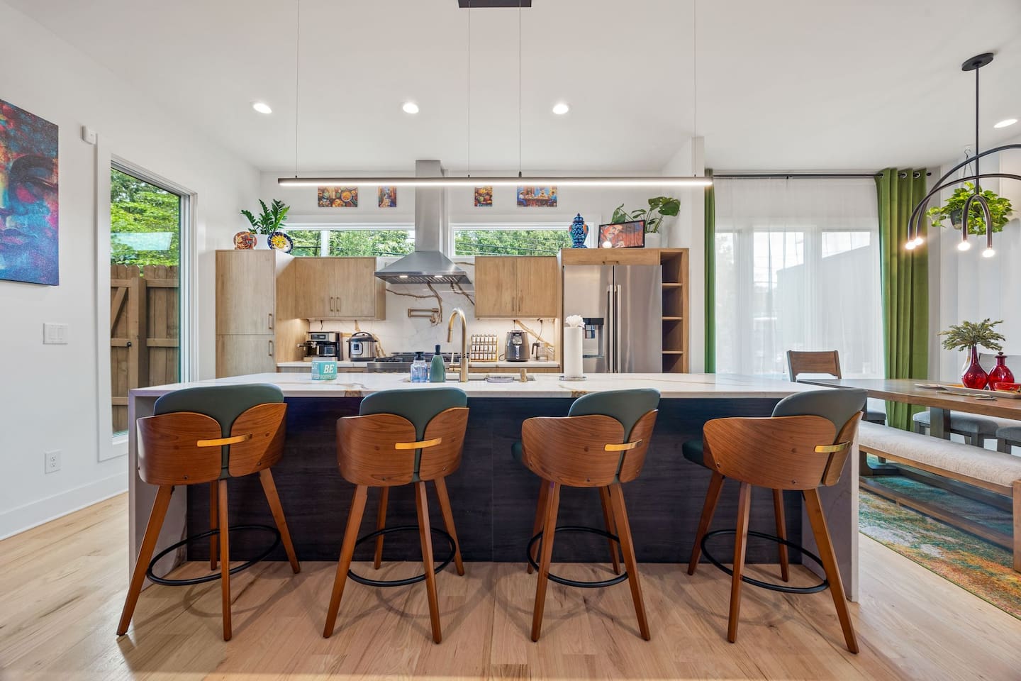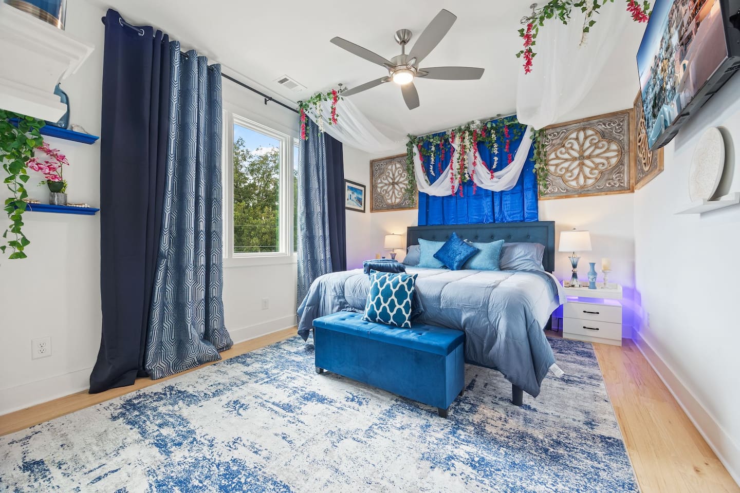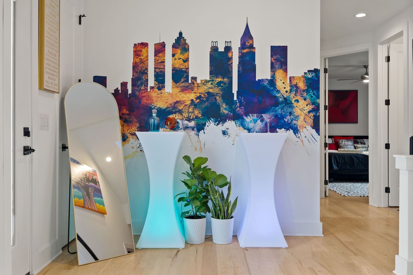Welcome to your dream stay in the heart of Edgewood! This brand-new 4-bedroom, 4.5-bathroom modern home is designed for comfort, style, and entertainment. With multiple levels of outdoor living, city life views, and premium amenities, it’s the perfect Atlanta getaway. Step inside to an open-concept floor plan with sleek finishes and modern design throughout. Overall, in this unique, one-of-a-kind luxury home, you will enjoy: 🛌 4 spacious bedrooms, each has a different theme (Paris, Rome, Africa, etc.) each with plush king-size beds and smart TVs, see further details below. 🛁 4.5 full bathrooms with premium fixtures & spa-like showers. Each bedroom has a dedicated full-size bathroom. The half-bathroom is located on the main floor with the living room and kitchen. 🍳 Chef’s kitchen with high-end appliances & island seating 🎱 Entertainment/game room featuring a pool table, skee-ball machine, board games, 2 flat screen TVs and lounge space including out on the spacious patio deck. 🏡 3 levels of outdoor patios for dining, lounging, and enjoying the view 🛁 Private 5seat hot tub for relaxation (NOW AVAILABLE ) 🔥 Outdoor fire pit for cozy evenings (Coming Soon) Every detail has been carefully curated for both luxury and comfort!! Each bedroom has a different theme: Bedroom 1: Brazil – Vibrant Energy Celebrate the colorful vibrancy of Brazil with a room alive with bold patterns and tropical inspiration. Lush greenery, bright jewel-toned textiles, and playful art give the space great energy, while a luxurious queen bed ensures total comfort. Enjoy a full-sized bathroom located next to this room. Bedroom 2: Greece – Coastal Serenity Step into the tranquil charm of the Greek Isles with crisp white walls, soft blue accents, and airy linen textures. This bedroom features a plush queen bed, and subtle touches of Santorini. Enjoy a full-sized bathroom located next to this room. Bedroom 3: Paris – Romantic Elegance The Paris room radiates timeless romance with chic sophistication, featuring the beauty Eiffel Tower wall, Paris theme pillows atop the plush queen bed and several other Paris themed finishing touches for those who want refined luxury and a touch of passion. Enjoy a full-sized bathroom located next to this room. Bedroom 4: Africa Master Bedroom w/luxury en-suite bathroom. Enjoy the en-suite large , spa bathroom with walk-in shower, spa bathtub and spacious walk-in closet. Rich earth tones, natural textures, and bold patterns define this exotic space. A large king size bed draped in soft linen evokes safari luxury, while tribal-inspired art and handcrafted décor bring authenticity. This is the perfect space for both adventure and comfort — a perfect blend of wild spirit and modern indulgence.