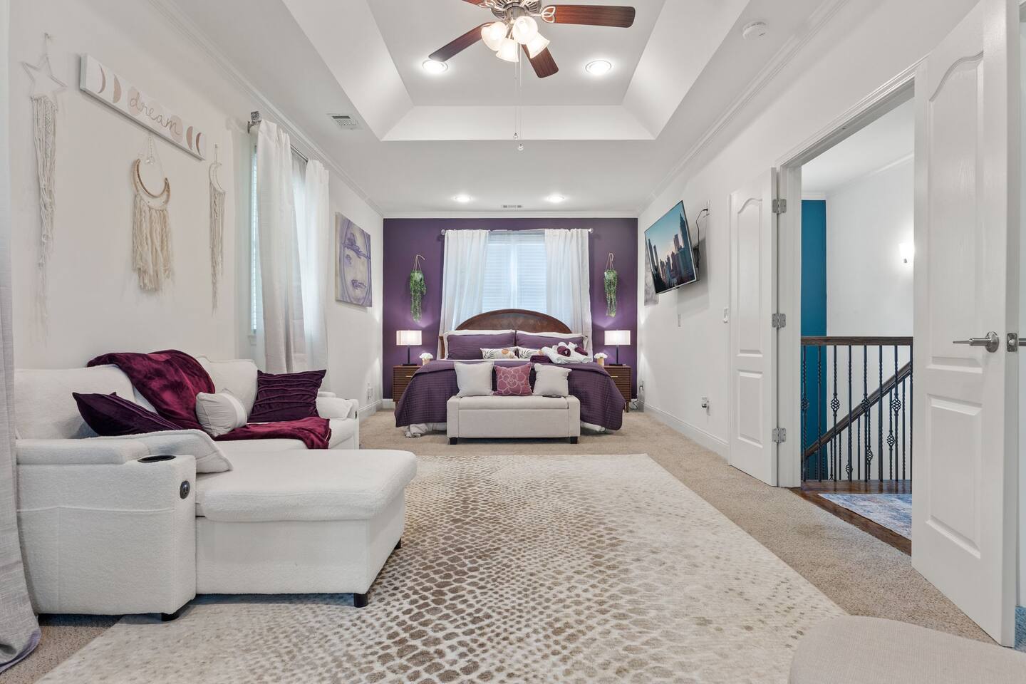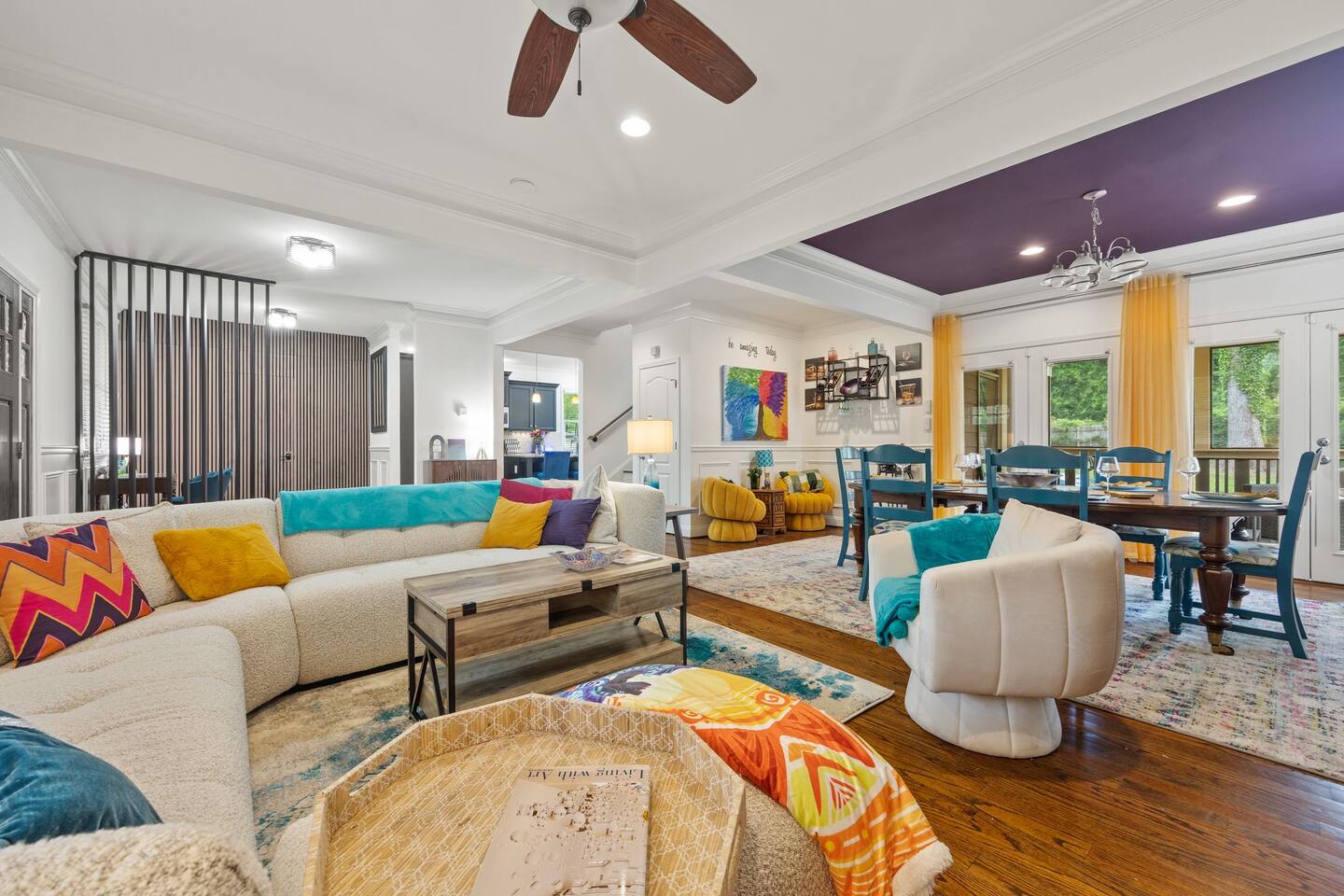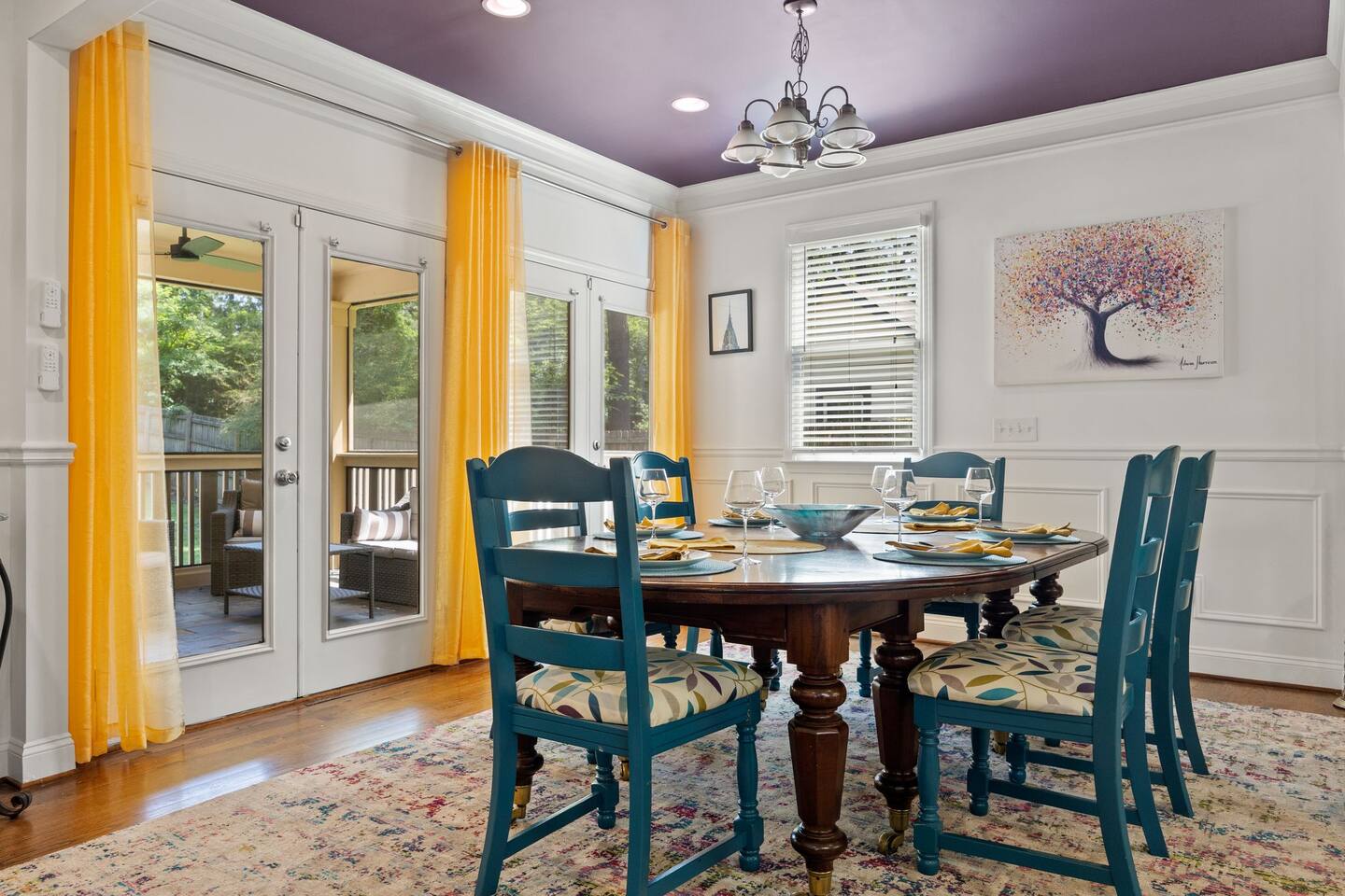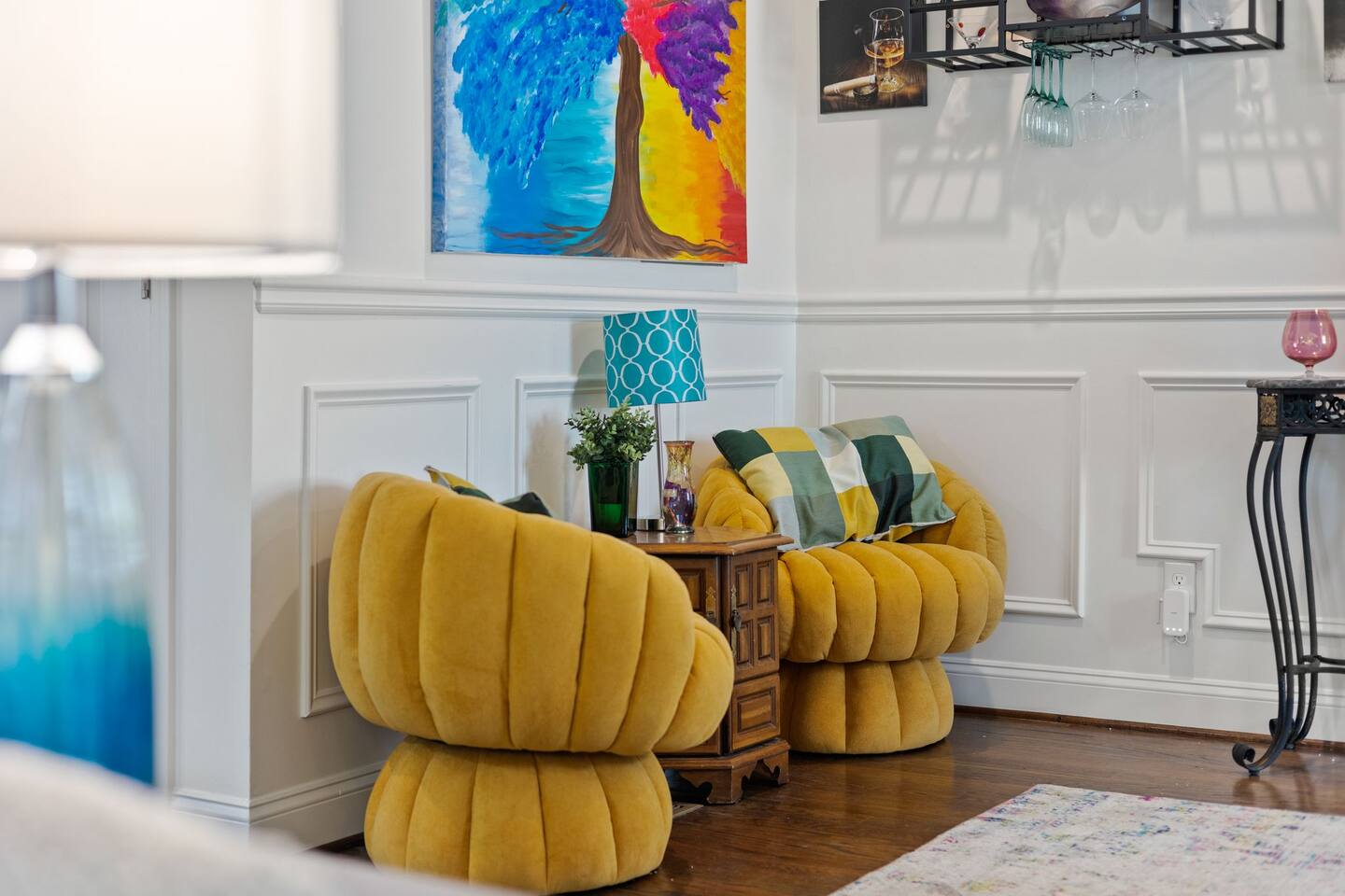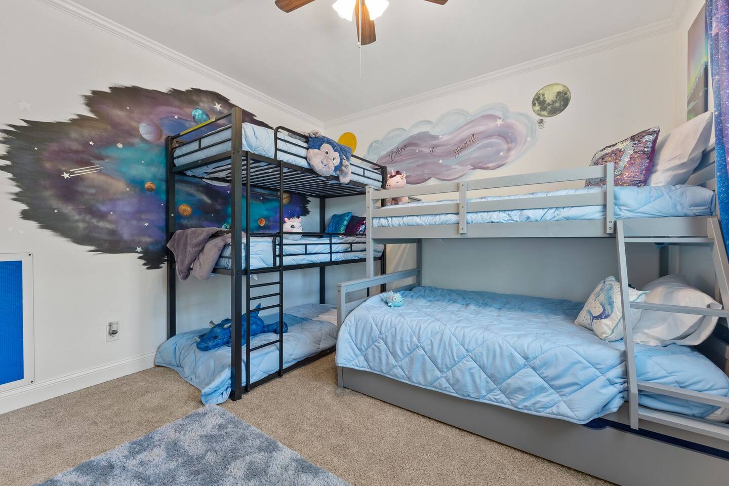 Guests will be absolutely blown away by the spacious open floor plan of the main level of the home with all new stylish and family friendly furnishing in the living room, dining room and kitchen. Sink yourself into the comfy sectional sofa in the living room after a long day of travel or work, or plan a nice meal and sit around the large dining room table with your friends and family or take a load off on the screened patio porch. Don't forget to take in the vibrant colors of the accent walls throughout the home, as well as beautifully, hand painted walls and murals throughout the home. We really love the yellow chairs in the corner of the dining room, perfect to lounge in with a friend, have a sip of wine or talk sports or politics. The floating privacy wall around the office desk is perfect for your work from home needs. And don't miss the tranquil half bathroom on the main floor, hidden behind the paneled walls. The kitchen features stainless steel appliances - refrigerator, stove, oven, microwave and dishwasher. The kitchen is appointed with elegant blue barstool chairs at the kitchen counter and a dining table in the kitchen with a flatscreen tv on the wall. All 3 bedrooms are located upstairs. You will be swept off your feet by the large, showroom style master bedroom, with a large King bed on one side of the room, along with a flatscreen TV, as well as a full-sized living room featuring a cozy sofa and sitting area for relaxing, reading and conversating. The en-suite bathroom features a double sink, walk-in shower, separate tub and separate toilet room. Down the hall, the 2nd bedroom features a soft carpeted floors, a king size bed with ample space for a dresser and wall mounted TV as well as a storage closet. The 3rd bedroom features 5-6 total beds, including a triple stacked bunk bed and a twin/full size bed combo that also has a pull-out twin bed underneath. We are thrilled to share that we focused on making this bedroom sensory and autism-friendly! We added fun features like a cozy sensory tent and an inflatable chair that’s perfect for relaxation. Bright colors and playful textures were key in creating a fun yet calming environment. Did you know that incorporating sensory elements can help reduce anxiety and improve focus? It has created a festive haven for everyone. Also located upstairs is the shared bathroom in the hallway for the 2nd and 3rd bedroom guests to share, along with a stackable washer/dryer at the end of the hallway in the laundry room. Finally, the outdoor space of the home is just as warm and cozy as the inside, perfect for everyone who enjoys indoor and outdoor living. There are full size porches on the front and back porch,. The back porch features a lovely porch swing loveseat, along with the screened in patio with all new outdoor chairs and sofa. The backyard is massive, and currently features a small firepit. Stay tuned for many more outdoor amenities to be added soon, including a covered hot tub and much more! Events & Additional Guests Policy The nightly rate covers lodging only for the number of guests listed on your reservation. Any event, gathering, or visit involving additional guests—no matter the size or duration—requires prior approval and an additional event fee. Extra guests or events are not included in the standard booking price and may result in additional charges if not disclosed in advance. Damage Protection & Security Policy (Applies in Limited Cases): To help us maintain this home to the highest standard for all guests, a refundable security deposit or small damage waiver may be required in limited, clearly defined situations, including: • All first-time renters/guests on Airbnb with no prior reviews • All guests under the age of 25 • All reservations during the 2026 World Cup in Atlanta due to unusually high demand The coverage is designed to protect against minor accidental damage only and helps us keep the home beautifully maintained. Guests with established and positive Airbnb review history/reviews ARE NOT subject to this requirement. We truly appreciate your understanding and look forward to hosting you.